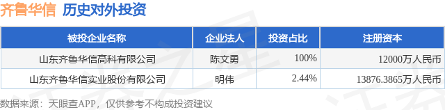 本站消息,根据天眼查APP显示,齐鲁华信(920832.BJ)新增一起对外投资事件,被投资公司为山东齐鲁华信高科有限公司,法定代表人陈文勇,投资占比为100%。该公司从事化学原料和化学制品制造业,注册资本为12000万人民币。目前启泰网,齐鲁华信共存在对外投资2项,详见下表: